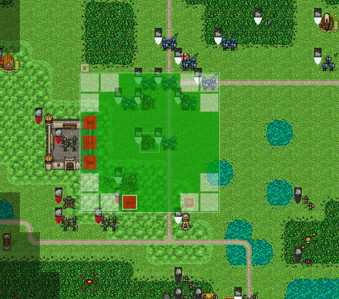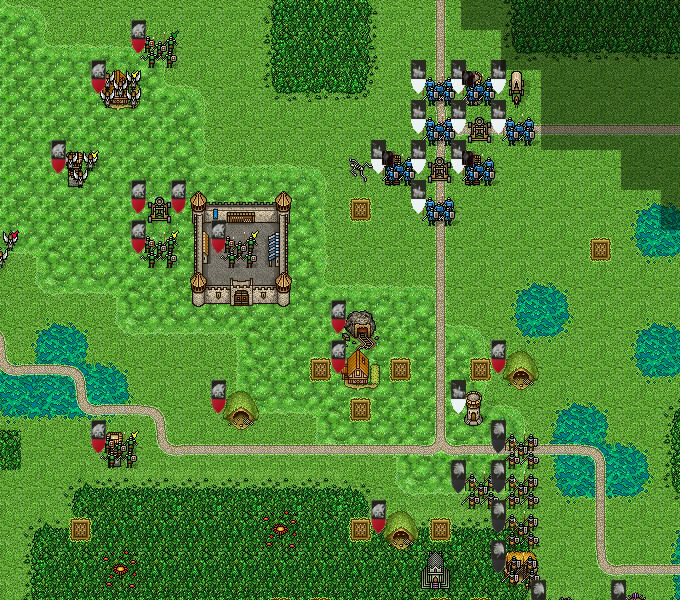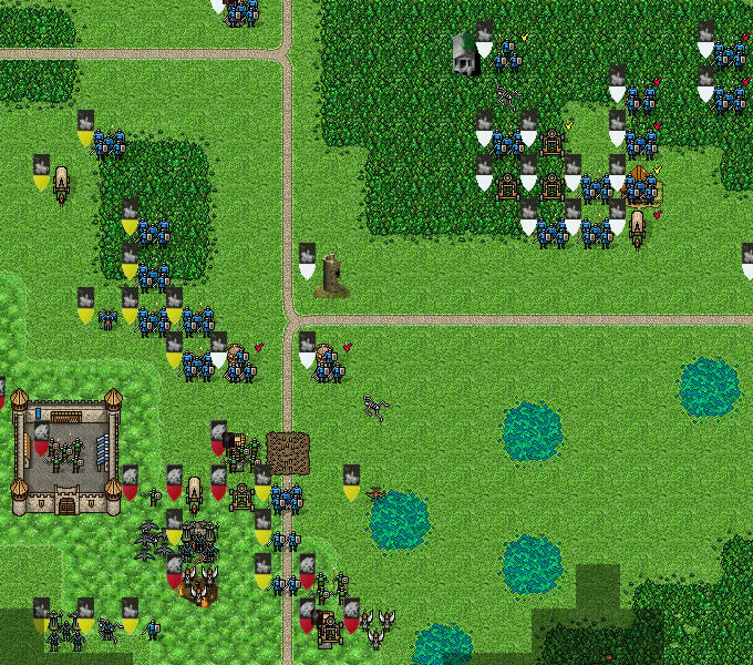 Dwarves attack the catapult defended by cavalry in order to decrease danger to the castle. Four champions lead the assault. Guard is positioned to target the knight!